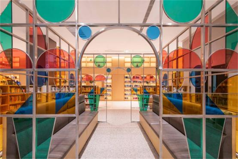 “书院八景 ”之一的文献借阅区与几何造型海派彩色玻璃。徐家汇书院供图