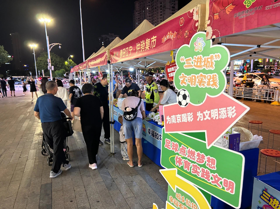 同样热闹的场面,也在江宁区的百家湖商圈上演。暑气未消,江宁百家湖商圈21世纪太阳城商场的户外广场上,一排印有“善田江宁 供销集市”字样的小棚子已经搭好,棚子上还挂着“为南京喝彩,为文明添彩”“足球点燃梦想,体育实践文明”等牌子,为“苏超”助威。